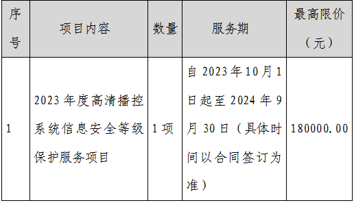 1、標(biāo)的名稱:2023年度高清播控系統(tǒng)信息安全等級保護服務(wù)項目