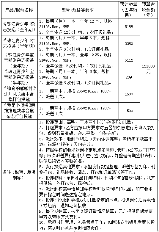 1、標(biāo)的名稱:《珠江青少年》雜志三水區(qū)、高明區(qū)發(fā)行投遞派送服務(wù)采購(gòu)項(xiàng)目(第二次)