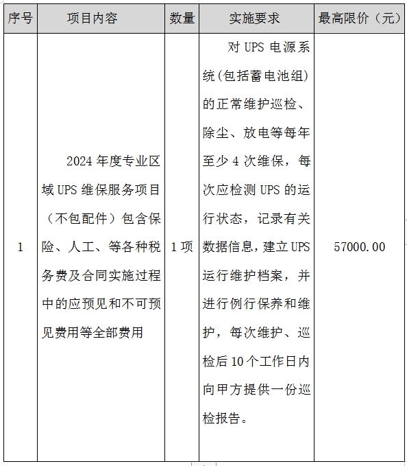 1、標(biāo)的名稱:2024年度專業(yè)區(qū)域UPS維保服務(wù)項(xiàng)目(不包配件)