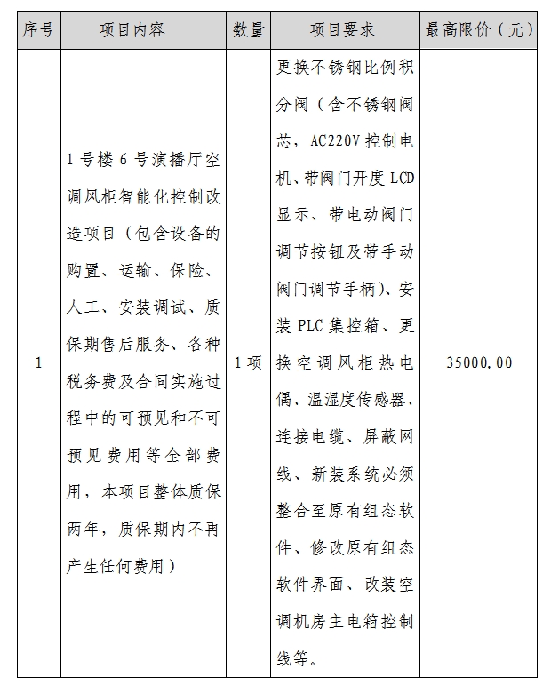 1、標(biāo)的名稱:1號(hào)樓6號(hào)演播廳空調(diào)風(fēng)柜智能化控制改造項(xiàng)目