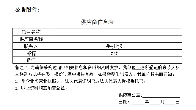 符合資格的供應(yīng)商應(yīng)當(dāng)在2024年09月10日至2024年09月14日(上午09:00至11:30,下午14:30至17:30,北京時間,法定節(jié)假日除外),將填報后的公告附件內(nèi)容發(fā)送電子郵件并通知采購人,資料需采用WORD和PDF格式制作的電子版各壹份(其中PDF格式文件必須為簽字蓋章后的彩色掃描件)發(fā)至采購人郵箱:24808615@qq.com,郵件名稱命名為:項目名稱+供應(yīng)商名稱。供應(yīng)商所填報的聯(lián)系方式必須確保始終有效及聯(lián)系暢通,所填報的電子郵箱必須確保每天工作時間內(nèi)至少查看1次。