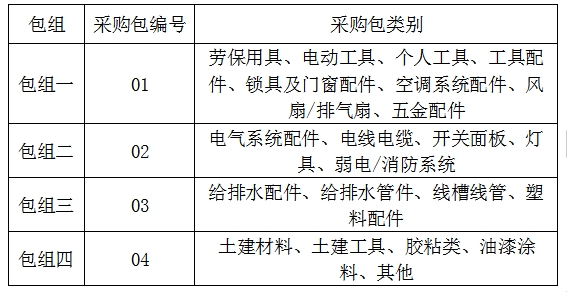 采購需求:佛山珠江傳媒物業(yè)管理有限公司工程維修材料定點采購及配送服務(wù),本項目分為四個采購包,如下表所示。
