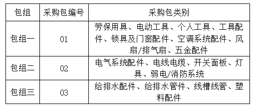采購需求:佛山珠江傳媒物業(yè)管理有限公司工程維修材料定點采購及配送服務(wù),本項目分為三個采購包,如下表所示。