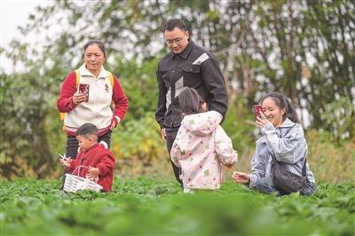 草莓園里,游客提籃彎腰,孩子的歡呼聲此起彼伏?!肮?jié)假日人多,很多都是一家子來,這片草莓都快被摘完了?!惫麍@負(fù)責(zé)人林姨笑著說。