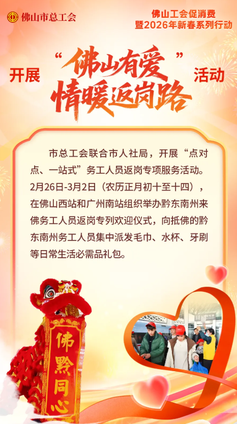 佛山工會心系各位職工通過七大行動,從消費補貼到團圓盆菜,從年味體驗到歸途守護,讓留在佛山過大年或返鄉(xiāng)的你玩得開心、過得舒心!