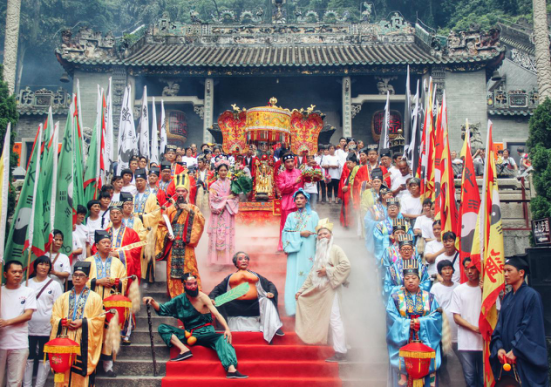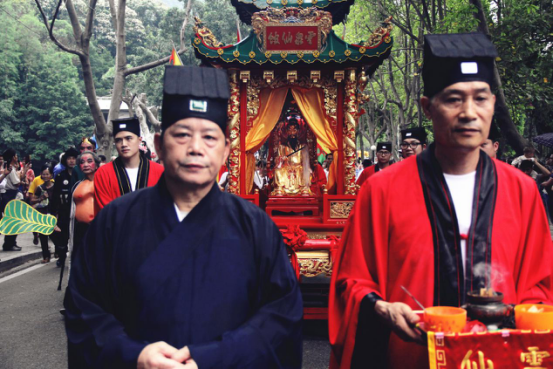 每年的西樵山“大仙誕”文化節(jié),最讓民眾關(guān)注的就是呂祖巡游了。當(dāng)日的云泉仙館信眾云集。伴隨著藹藹迷霧,呂洞賓、鐵拐李、漢鐘離、張果老、曹國(guó)舅、藍(lán)采和及何仙姑七位神仙騰云駕霧而來(lái),在悠揚(yáng)的古笛聲,齊聚一堂同賀呂祖壽誕。