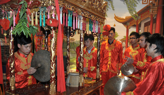 銅鑼:一般位于龍舟后部。歷史上九江的擊鑼手中,最有名是陳禮,他技藝高超,能將所擊的銅鑼拋高數(shù)丈,擲過(guò)“三元橋”頂,待龍船穿過(guò)橋底后,用手接住,來(lái)回表演多次,從未失手。陳禮是一艘名叫“忠山”的龍船上的擊鑼手,故九江有“忠山鑼”的說(shuō)法。