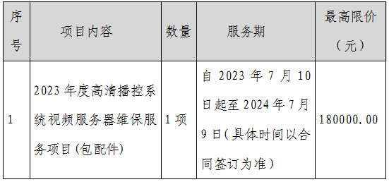 1、標(biāo)的名稱:2023年度高清播控系統(tǒng)視頻服務(wù)器維保服務(wù)項(xiàng)目(包配件)